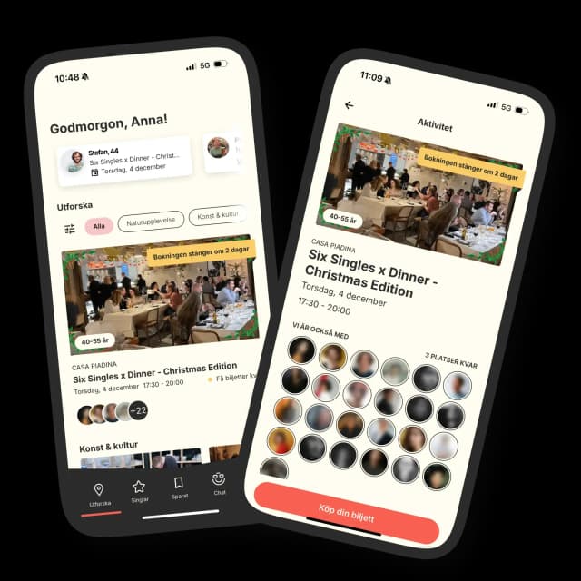 Slipp ghost och evighetssvajp. Med MinglMe träffar du singlar i Stockholm genom riktiga aktiviteter – från italiensk matlagning och padel till quiz, boule och kajak. Våra singelevent är skapade för att du ska träffa nya människor i samma livsfas, på ett äkta och socialt sätt.